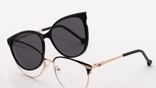 Os óculos Clip-On são armações que vêm com uma lente adicional, magnética ou com encaixe frontal, que se sobrepõe à lente de grau.